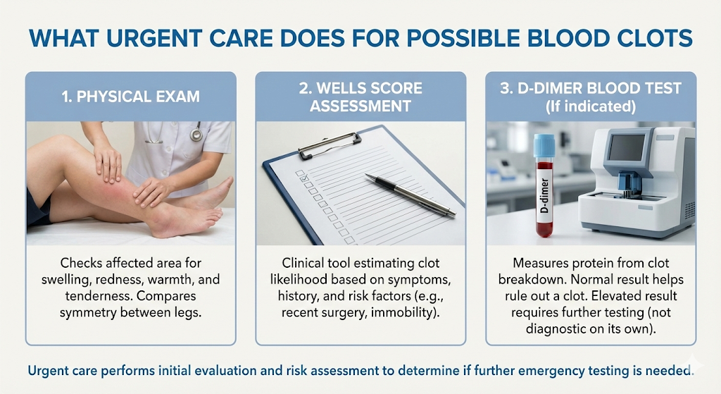 Urgent care can start process of checking for blood clots, but most locations cannot confirm a diagnosis on their own. Many urgent care centers can perform a physical exam, assess your risk factors, and run a D-dimer blood test to help determine whether a blood clot is likely. However, imaging tests needed to actually see and confirm a clot, like a duplex ultrasound or CT scan, are often not available at standard urgent care facilities.
