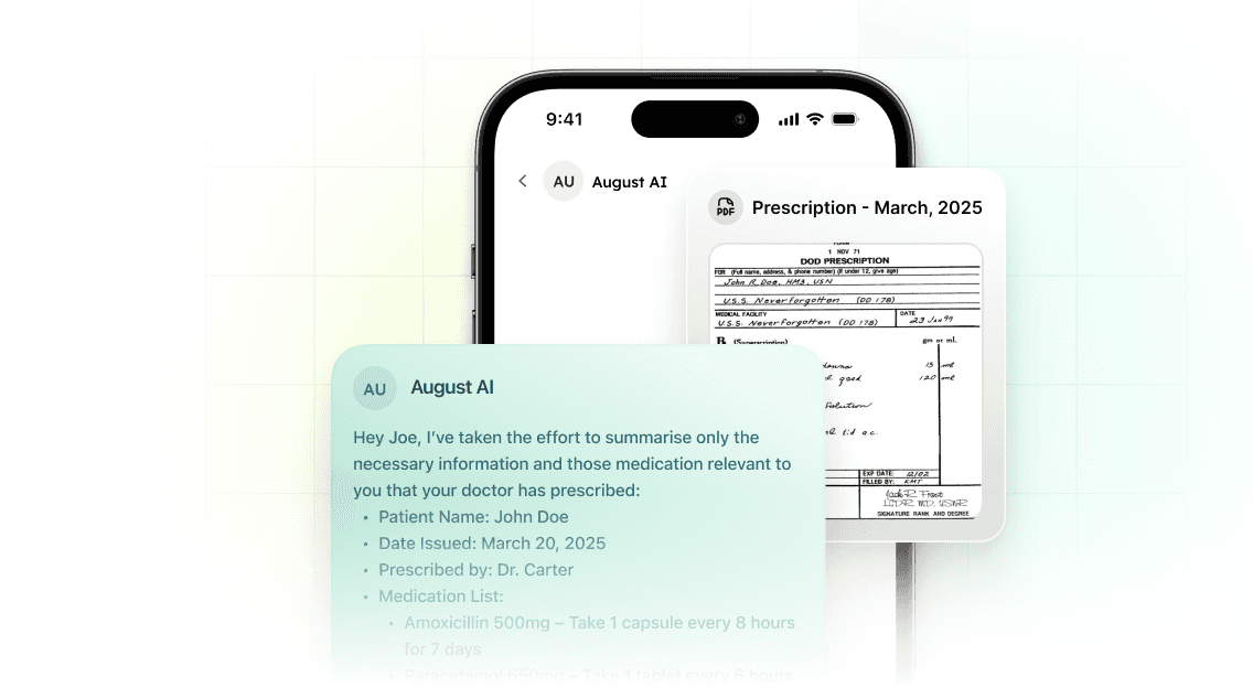 August quickly scans your health records, highlighting key details—like past conditions, treatments, or allergies—so you get personalised, accurate guidance instantly.